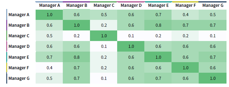 In Figure 1, the pure alpha generating abilities of these managers appears strong and consistent, but Figure 2 demonstrates that it can vary. This variance results from the tendency of fixed income managers to generate their value-add in different ways relative to other managers. Some are better at security selection, while others may be better at sector allocation. For some, allocations may be more quantitatively based, while others may be more qualitative. These differences show up over time in the correlation of returns in excess of the benchmark, as depicted in Figure 3. Lower figures (or lighter shades of green to white) indicate that excess returns are less correlated.