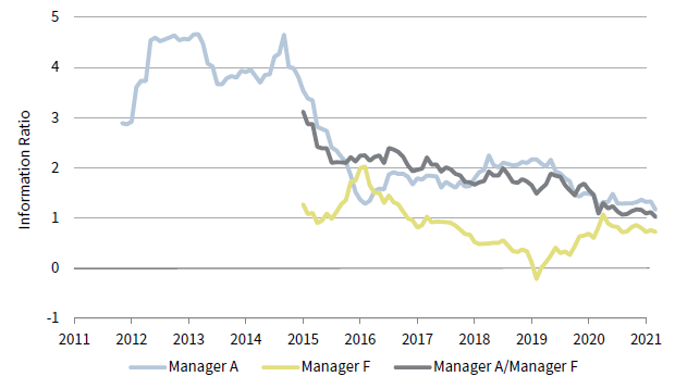 Creating a portfolio of different active fixed income managers with different strategies may aid portfolios more than relying on just one manager. For example, consider a simple portfolio composed of two active fixed income managers with equal capital allocations, but different approaches to portfolio management. The different strategies help lower the portfolio’s tracking error and create a more stable return pattern. As a result, the portfolio has a more stable—and potentially higher—information ratio, as depicted by the Manager A/Manager F line in Figure 4. This can enable a plan sponsor’s fixed income portfolio to maintain alpha generation with lower volatility to the plan’s liability while also reducing manager selection risk.