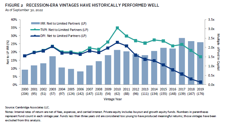 Leaning into SEE thematic investing may help buffer portfolio performance and mitigate risk, particularly in market downturns, as we believe many industries that align with high-impact SEE themes tend to be less prone to the negative effects of recession. In fact, while recession-era vintages have historically performed well (Figure 2), a deeper look at SEE-aligned sectors exposes resilience (Figure 3). We recognize that many SEE themes overlap with historically defensive sectors, but these are also areas that address fundamental human needs and are ripe for innovation. Managers with high SEE integration are intentionally focused on making better and more accessible products within these industries to address those needs.