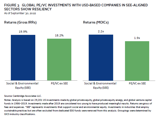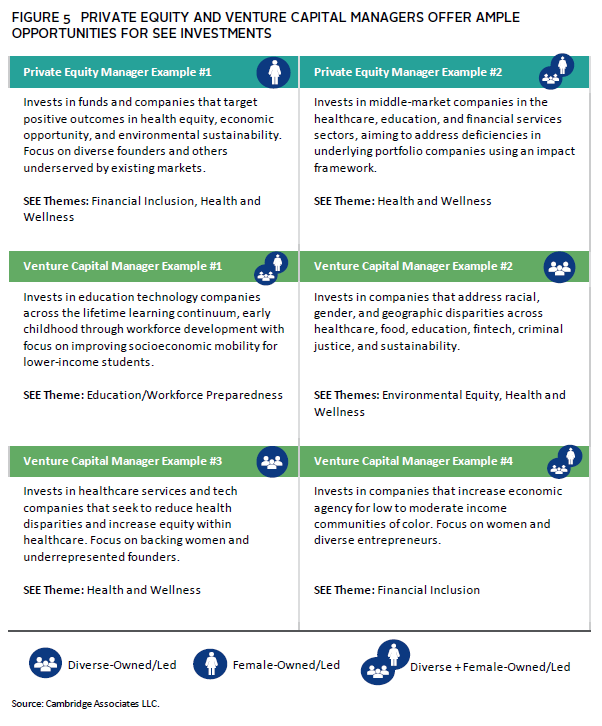 There is no “one size fits all” approach to building a resilient and impact-forward portfolio. However, leveraging the SEE framework can support discipline, rigor, and more thoughtful implementation strategies across market cycles. We believe there is an existing and growing universe of SEE-aligned managers that have the potential to outperform broad equity benchmarks and to reduce risk because of their integrated focus on improving social and environmental equity (Figure 5).