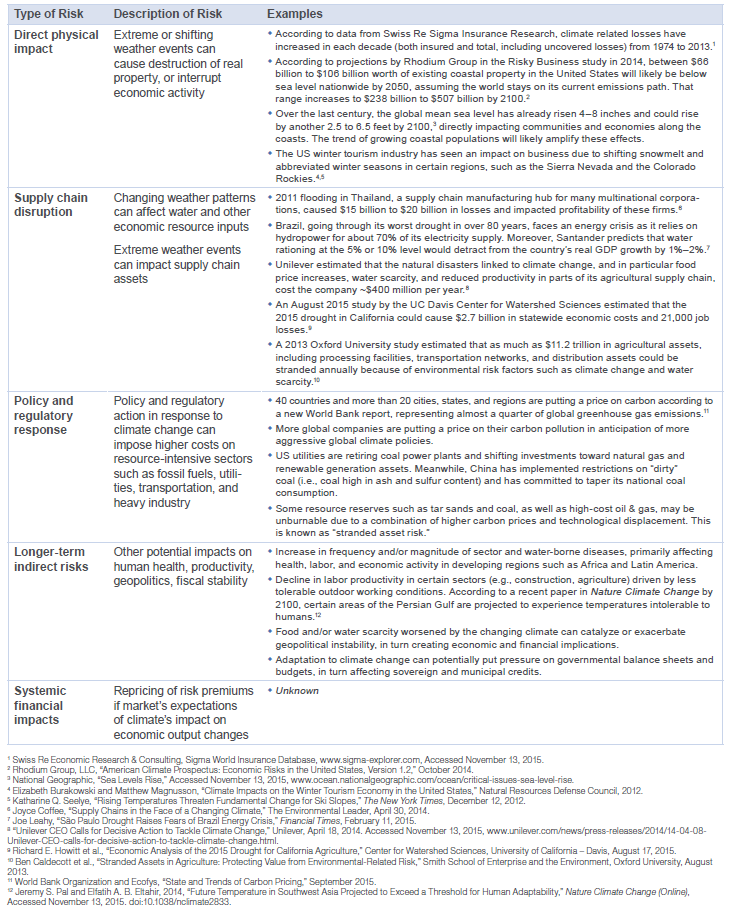 Naturally, economists have and will continue to debate the methodology of these imperfect forecasts. We cite these forecasts not to draw any conclusions on the certainty or magnitude of economic loss, but rather to paint a picture of one tail risk scenario. Directionally, the economic risks to the status quo introduced by climate-related uncertainties skew to the downside, not the upside. The various economic risk factors of climate change are complex and multi-dimensional. They will likely range in their method, timeframe, and severity of manifestation. Some impacts may be sudden, while others may be much more gradual. The many facets of climate risk 6 include: (1) the physical impairment or destruction of real estate property and infrastructure assets caused by more frequent or severe extreme weather events; (2) supply chain disruptions to businesses as a result of these events, particularly related to disruption of resource inputs, such as water; (3) increased costs for carbon-intensive sectors such as coal, oil sands, and many utilities as policymakers and regulators take action in responding to climate change and other environmental issues; (4) longer-term indirect effects on human health, productivity, geopolitical and fiscal stability; and (5) potential systemic re-pricing of broader risky assets driven by increased societal risk aversion to climate impacts. These risks are described in more detail in Figure 1.