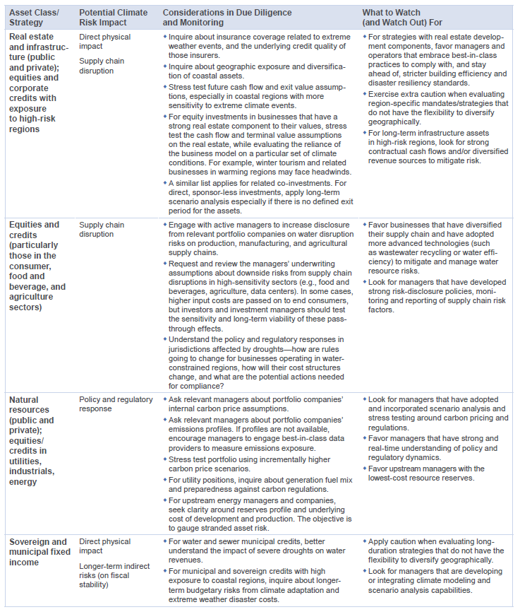 Overlaying a climate risk lens in manager diligence and monitoring. Applying a “climate overlay” in manager diligence and monitoring requires ongoing discussions around the many facets of climate risk (discussed above). Simply asking a question such as “how do you think about water security in your companies’ supply chain?” could lead to productive conversations about those companies’ sustainable competitive advantage and supply chain security. Similarly, asking a question such as “are your energy and industrial companies using an internal carbon price?” could prompt discussions about portfolio companies’ preparedness for more stringent carbon regulation. Asking long-term oriented real estate managers about the geographic exposure and diversification of properties, as they relate to coastal risks, should shed light on their risk management and time horizon. By engaging in these discussions, investors can actually gain more insight into managers’ thinking about all risks and not just climate risk. Figure 2 provides a few examples of overlaying a climate lens on the investment process for various asset classes. Of course, application of this overlay should fit within standard considerations such as valuations and near-term fundamentals to balance the longer-term dynamics with near-term catalysts. A possible outcome from this overlay exercise could be to take no immediate action upon assessing the risks, for example, if the investor feels comfortable that the underlying assets are expected to exit within the near term and/or are located away from high-risk coastal regions. The important takeaway is that the investor should integrate climate risk in the underwriting and ongoing monitoring process.
