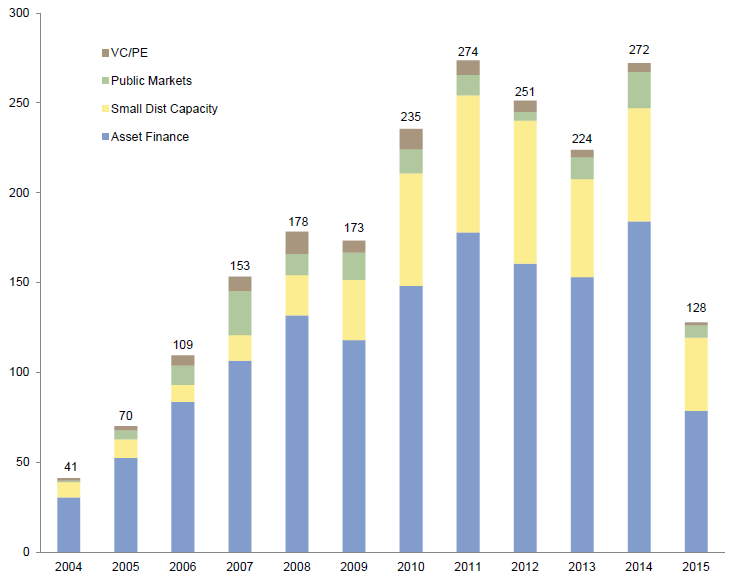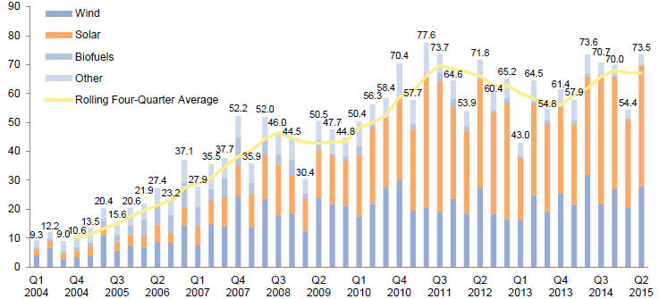 Notes: Data for 2015 are through June 30, 2015. Total values include estimates for undisclosed deals. Excludes corporate and government R&D and spending for digital energy and energy storage projects.