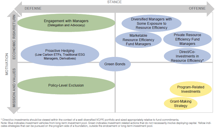 In Part I: Risks and the Playbook for Defense, we discuss the potential risks that climate change can inflict upon certain sectors and asset classes and outline corresponding strategies to defend against those risks. In Part II: Opportunities and the Playbook for Offense, we review the thematic areas across public and private asset classes to proactively capitalize on the evolving opportunity set within the “resource efficiency” sector. While we are framing the discussion into these two broad categories for the sake of simplicity, we recognize that underlying investment approaches and themes lie along a continuum where lines of separation between “defense” and “offense” are blurred. The key for long-term investors is to develop a cohesive and customized strategy that fits their beliefs, motivations, and governance structures.
