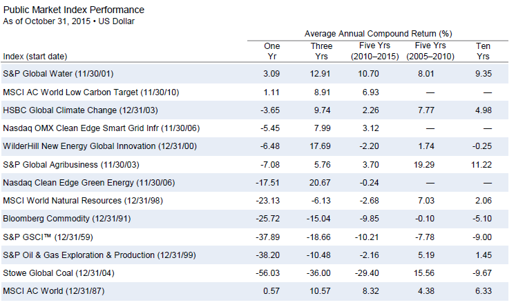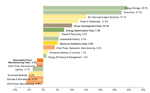 Sub-sectors like smart grid, energy storage, power development, environmental services and agricultural solutions, and water-related companies have generated reasonable to strong rates of returns in aggregate.