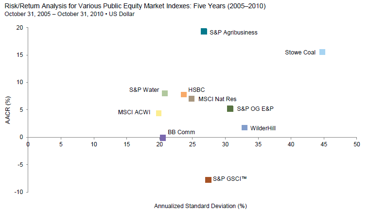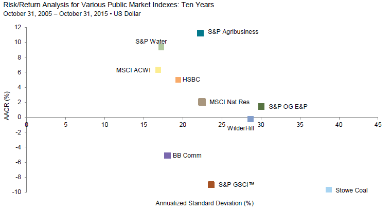 The MSCI World Natural Resources is based on the MSCI ACWI, its parent index, and includes energy sector stocks plus metals & mining, paper & forest products sub-industries. The MSCI data are composed of a custom index calculated by MSCI.