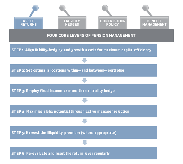 • A capital-efficient balance between liability-hedging assets (tasked with hedging changes in pension obligations due to changes in the discount rate) and growth assets (tasked with generating superior asset returns in excess of the discount rate);