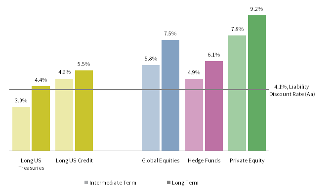 Notes: Intermediate-term capital market assumptions for fixed income are current yields on relevant market benchmarks; for all other asset classes, they are a ten-year forecast that explicitly models the current valuation of each asset class, the “fair” or average valuation of each asset class historically, and the estimated return associated with reverting to “fair value” over a ten-year period. These assumptions assume moderate real earnings growth, low corporate default rates, and a return from current values to fair value for equity multiples, government bond yields, and corporate credit spreads. Fair values are largely based on historical averages. Long-term capital market assumptions reflect a blend of ten years of intermediate-term capital market assumptions and 15 years of equilibrium capital market assumptions that focus on the fundamental risk and return characteristics of each asset class, based both on long-term data and capital markets theory, which is agnostic to the current market environment. Both approaches assume an inflation assumption of 2.5%. Expected returns are net of investment manager fees but not any other expenses. Liability discount rate reflects the FTSE Pension Liability Index (Intermediate).
