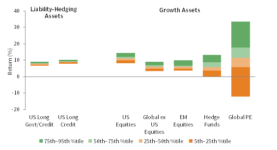 Notes: Liability-hedging assets data are sourced from eVestment; Cambridge Associates data are used for all other asset classes. Returns for bond, equity, and hedge fund managers are average annual compound returns (AACRs) for the ten years ended September 30, 2018, and only managers with performance available for the entire period are included. Returns for private investment managers are horizon internal rates of return (IRRs) calculated since inception to June 30, 2018. Time-weighted returns (AACRs) and money-weighted returns (IRRs) are not directly comparable. Cambridge Associates LLC’s bond, equity, and hedge fund manager universe statistics are derived from CA’s proprietary Investment Manager Database. Managers that do not report in US dollars, exclude cash reserves from reported total returns, or have less than $50 million in product assets are excluded. Performance of bond and public equity managers is generally reported gross of investment management fees. Hedge fund managers generally report performance net of investment management fees and performance fees. CA derives its private benchmarks from the financial information contained in its proprietary database of private investment funds. The pooled returns represent the net end-to-end rates of return calculated on the aggregate of all cash flows and market values as reported to Cambridge Associates by the funds’ general partners in their quarterly and annual audited financial reports. These returns are net of management fees, expenses, and performance fees that take the form of a carried interest.