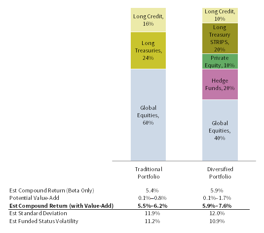 Notes: Expected return, risk, and funded status risk reflect intermediate-term capital market assumption. Assumed funded status is 75%, liability duration is 13.0 years, and liability discount rate is 4.1% (the liability discount rate reflects the FTSE Pension Liability Index–Intermediate). Funded status volatility accounts for unhedgeable liability risk. Potential value-add reflects no value-add for Treasuries and STRIPS, the difference between 25th to 50th percentile manager returns shown in Figure 3 and relevant indexes for public markets, and the difference between 25th to 50th percentile manager returns and the median manager return shown in Figure 3 for alternatives. The calculation accounts for average manager fees by asset class.