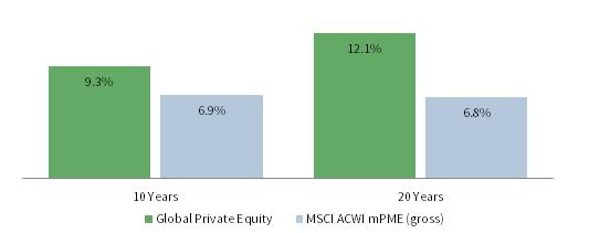 Notes: Based on all global private equity (buyout, private equity energy, growth equity, and subordinated capital funds) and venture capital funds tracked by Cambridge Associates that were active during the time periods analyzed. Returns for private investments are based on quarterly end-to-end internal rates of return, which are net of fees, expenses, and carried interest. Cambridge Associates mPME methodology replicates private investment performance under public market conditions and allows for an appropriate comparison of private and public market returns. The mPME analysis evaluates what return would have been earned had the dollars invested in private investments been invested in the public market index instead. Total return data for the MSCI ACWI are gross of dividend taxes.
