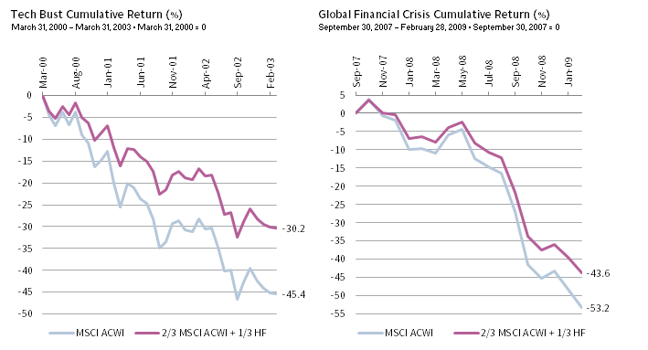 Notes: Data are monthly. Total return data for the MSCI ACWI are gross of dividend taxes prior to 2001 and net of dividend taxes thereafter. Hedge fund returns shown are net of manager and CA fees. CA fees are estimated based on a model fee calculation using the highest CA fee schedule appropriate for the client type and service provided. The model fee deducted was equal to or greater than actual fees paid by that client to CA. Please see figure notes and the performance disclosure at the end of the publication for information about the hedge fund component.