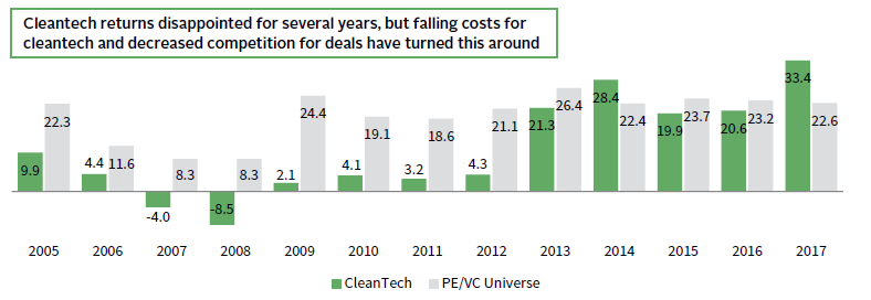 Notes: Performance includes 1,411 investments and reflects gross deal level returns from 2005 to 2017. These investments are composed of all company-level investments made by private equity and venture capital partnerships assessed as eligible for the CA Clean Tech Company Performance Statistics. As of September 2019, Cambridge Associates (CA) screened over 93,000 investments held by over 7,800 funds to identify cleantech investments. CA includes companies and projects in the cleantech sector if they (1) develop non-fossil fuel energy sources, (2) promote industrial efficiency by conserving resources and replacing existing processes with less-polluting alternatives, (3) recycle waste efficiently, or (4) provide a product or service that creates an environmental improvement. The full report is published quarterly and can be found at https://www.cambridgeassociates.com/private-investment-benchmarks.