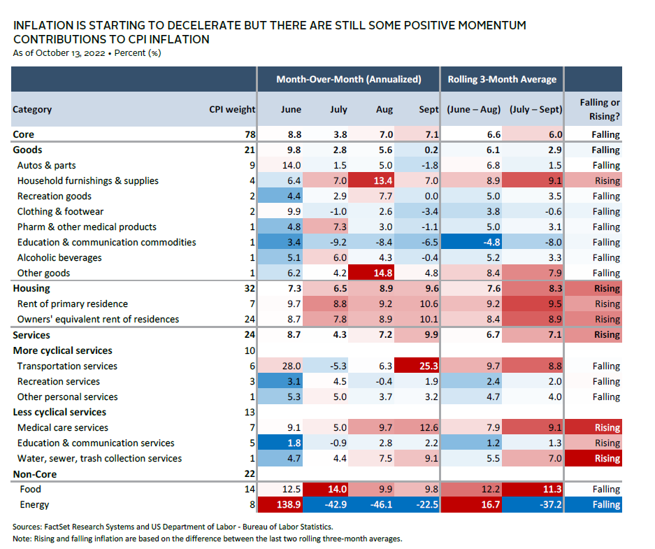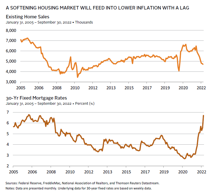 Wages are supported by persistent labor market strength and will only ease as the economy softens, a change that the Fed is trying to orchestrate. The latest labor report showed unemployment fell back to recent lows of 3.5% amid lower, but still robust, job growth and elevated quit rates. Wages continue to increase, even as the pace over the last two months has slowed to an annual rate of 3.6%—a level consistent with a 2% inflation target. Real wages are obviously in decline with headline inflation clocking in at 8.2% in September. Encouragingly, the number of job openings fell by 10% in August, so the labor market has softened some, but it remains unmistakably tight.