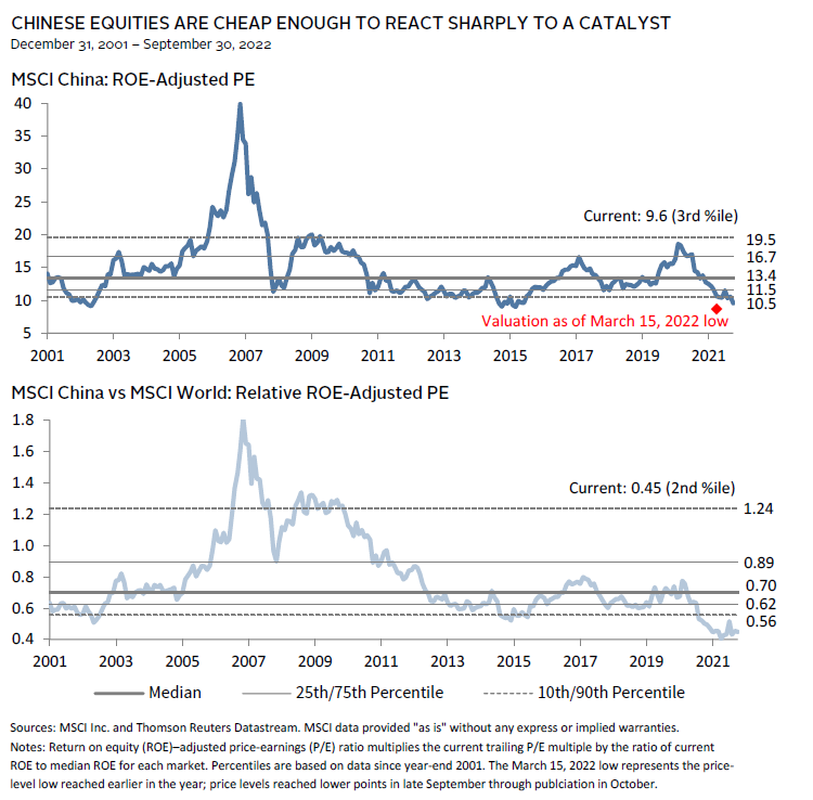 Due to the current uncertainty, the Chinese economy and equities are like a coiled spring, waiting for the downward pressure to be lifted. The market sell-off following the Party Congress shows that investors have now capitulated on any near-term recovery. Because valuations for Chinese equities are currently depressed, we think investors are compensated for the heightened uncertainty, especially since markets could react quickly and powerfully to any change in zero-COVID policy, making it very difficult for investors to time this pivot.