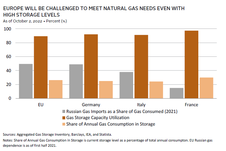 Most analysts expect that it will take at least two to three years before Europe can adjust to the elimination of Russian energy imports. Looking beyond this winter, Europe will need to source gas and refill storage, likely without any Russian gas, putting continued pressure on gas prices and economic growth.