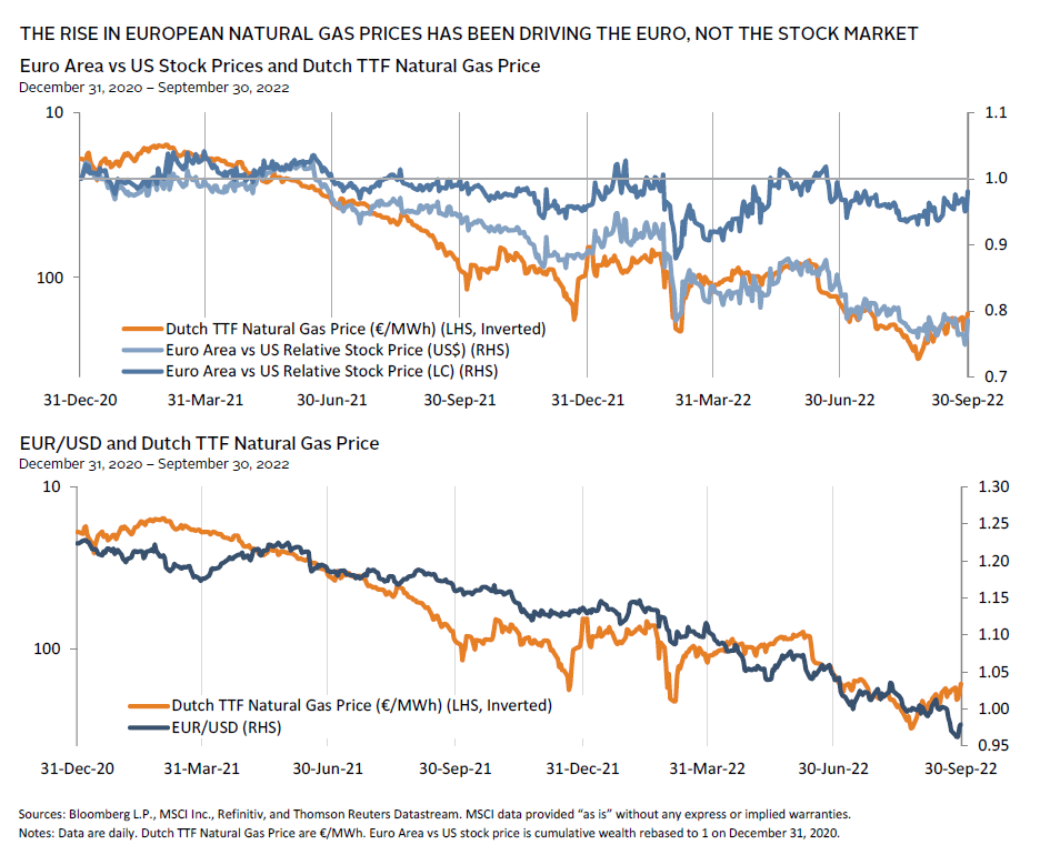 Euro area equities have fallen substantially this year, bringing valuations in line with their historical averages. Relative to US equities, euro area stocks have held up better in local currency terms but have underperformed sharply in US dollar terms. The euro has lost ground to the dollar this year even as interest rates have started to converge. Markets have adjusted to Europe’s narrowing current account surpluses, dragged down by expensive energy imports and relatively low growth expectations, while the US dollar continues to benefit from safe-haven inflows. Indeed, as shown in the chart below, the underperformance of euro area equities relative to the United States has moved in lock step with the increase in European natural gas prices, largely driven by the weakening euro. In other words, the euro has served as a relief valve while valuations have remained flat, although somewhat cheap, compared to global developed markets at about the 25th percentile of the historical distribution.