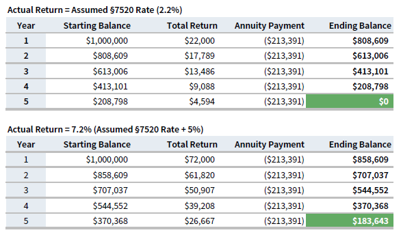 Even better, a GRAT remainder may be zeroed out and result in no gift tax or use of gift tax exemption. In other words, the specified payments back to the donor may be structured so that their aggregate present value (using the Section 7520 rate) equals the value of the property contributed to the GRAT, resulting in zero present value—and zero taxable gift—for the remainder interest. 3  Figure 1 illustrates these dynamics with the returns, annuity flows, and remainder amounts (highlighted in green) for a zeroed-out five-year GRAT funded with $1,000,000; one earns investment returns equal to an assumed Section 7520 rate of 2.2% (the approximate mean rate over the past ten years), and the other exceeds that hurdle rate by 5%.