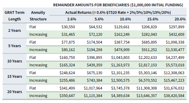 However, a shorter GRAT term also entails the risk of increases in the Section 7520 rate for any future GRATs. Thus, since Section 7520 rates are at record lows, it might be preferable to lock in these low hurdle rates for longer periods while they are available. 4 One could also hedge with a blended approach, using multiple GRATs and a range of GRAT term lengths—a “laddered” approach of sorts, as seen with bonds. Figure 2 illustrates the remainder values for $1,000,000 zeroed-out GRATs with the specified investment returns, term lengths, and payment structures (i.e., flat annuities or annuities increasing by 20% each year) under the 0.6% Section 7520 rate for June 2020. 5