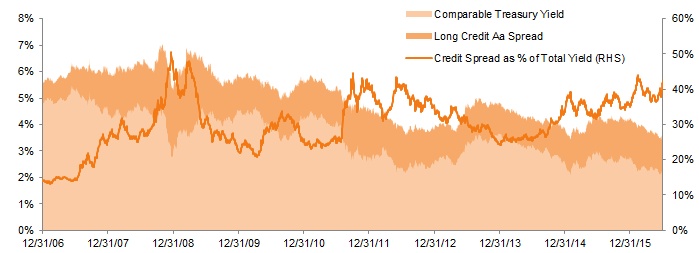 Figure 1. Decomposition of the Yield of the Barclays US Long Credit Aa Index into the Comparable Treasury Yield and Credit Spread