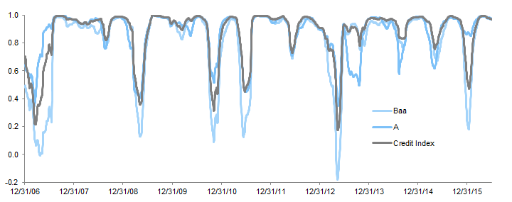 Figure 6. Rolling 100-Day Correlation to Barclays US Long Credit Aa Index Spreads