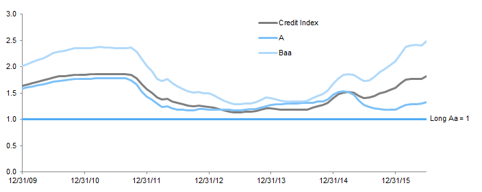 - The level of spreads tends to increase as quality decreases, with the overall long credit spread resting between the spreads of the A-rated and Baa-rated components;