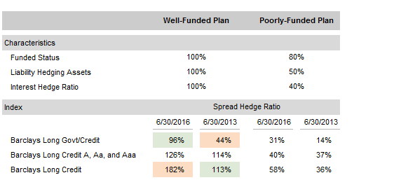 Consider a plan that is 100% funded and has a duration of 14.0 years. As of June 30, 2016, the Barclays Long Government/Credit Index would well match the portfolio, with an interest hedge ratio of 100% and a spread hedge ratio of 96% (Figure 8). Yet just three years ago, such a strategy was a much poorer match, with a spread hedge ratio of only 44%. The strategy with the best match three years ago, Barclays Long Credit, would be ill-matched today. This simple example illustrates how widely spread hedge ratios can vary over time. As expected, the impact of spread beta changes is greater for a well-funded plan with a high liability-hedging allocation than for a poorly funded plan.