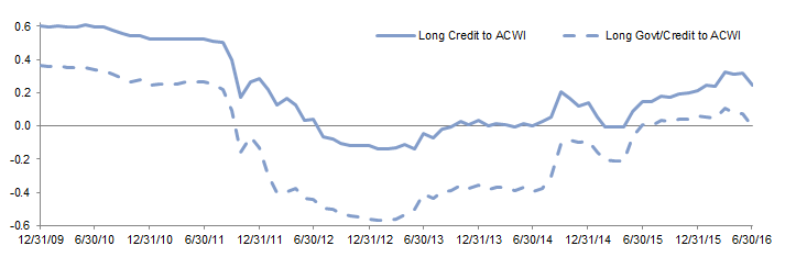 These spread correlations are reflected in total return correlations—rolling three-year correlations of the MSCI All Country World Index to the Barclays US Long Credit Index are consistently about 0.3 higher than correlations to the Barclays Long Government/Credit Index (Figure 10). Similar correlation differences exist for hedge funds and private equity.