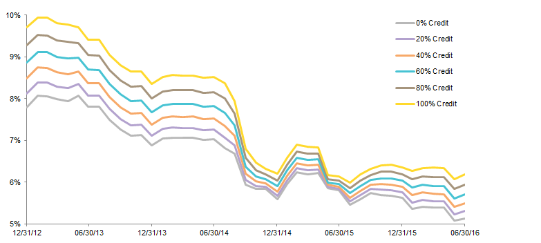 Consider a plan with a liability profile that follows that of the Citigroup Pension Liability Index – Short Duration and has a duration of 12.8 years (as of June 30, 2016). Suppose the plan is poorly funded (funded status ratio of 60%) and has an asset allocation of 40% to global equities with a beta of 0.8 to MSCI ACWI; 20% to hedge funds (proxied by HFRI Funds of Funds); and 40% to a duration-matched liability-hedging portfolio. The liability-hedging portfolio can be allocated to any blend of credit (proxied by a duration-matched blend of Barclays Long and Intermediate Credit Indexes) and Treasuries (proxied by a duration-matched blend of Barclays Long and Intermediate Treasury Indexes).