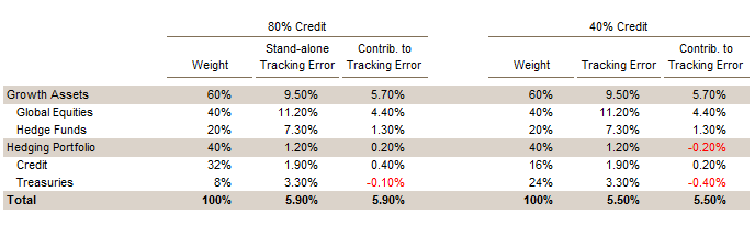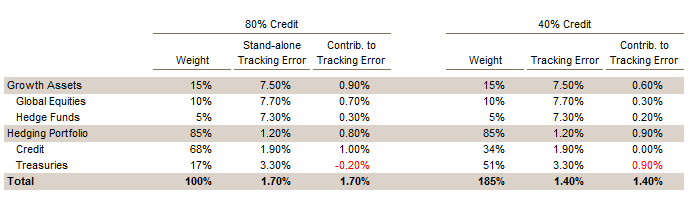 Relative to the contribution to the tracking error from the growth portfolio, however, the contribution from credit is relatively small. While it may be tempting to reduce tracking error by lowering credit exposure to 0% (and raising Treasury exposure to 100%), such a drastic move would result in a liability-hedging portfolio that significantly under-yields the liabilities and an asset allocation that is less likely to succeed in closing the asset-liability gap.