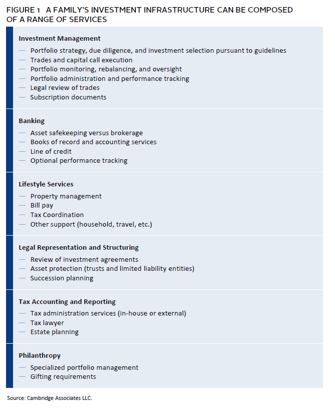 Many wealth owners try in earnest to take on all this work themselves, but find it becomes too challenging to manage in conjunction with other day-to-day obligations. In most cases, families should have someone readily available to undertake these responsibilities. Some investment advisors, including Cambridge Associates, can manage operational activities for clients—in either a fiduciary or advisory capacity. Alternatively, families who have opted to build a family office often handle portfolio operations with an in-house team.