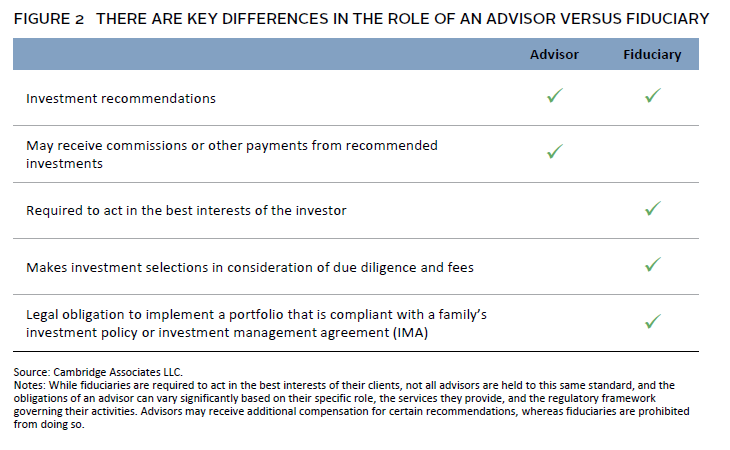 When selecting an investment advisor, families should first consider the difference between a fiduciary and advisory relationship (Figure 2). They should consider a fiduciary relationship if they seek a partner who is legally bound to act in their best interests, especially if they prefer not to be deeply involved in day-to-day investment decisions. On the other hand, an advisory relationship might be suitable for families who desire more control over their investment choices and are comfortable with a more collaborative approach.