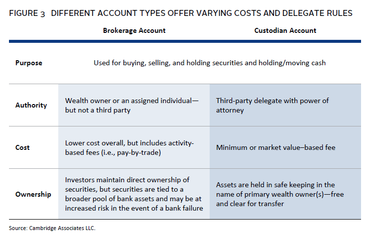 Another key infrastructure choice that families need to make involves selecting a bank and the type of investment account they will use to operate and oversee their portfolio. There are two main options to choose from: a brokerage or custodian account (Figure 3).