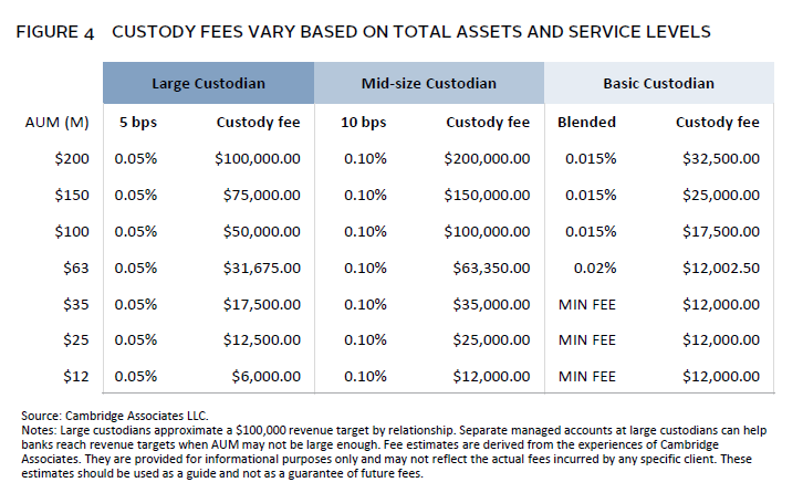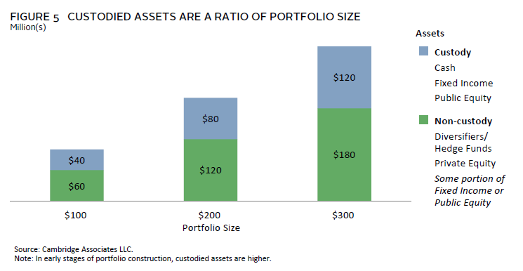 Large custodians target families with assets of $200 million or more. These banks generally have better online portals, more service options, investment capabilities, and superior customer service teams. However, they also have revenue targets to consider when taking on new business, so they prefer larger clients and typically charge around 5 basis points (bps) on market value. Mid-size custodians generally charge a higher fee of around 10 bps, but don’t have defined revenue targets by relationship. In some cases, these banks may want to maintain an existing relationship with the family if a third-party manager is brought in. Alternatively, families with smaller mandates can seek out smaller custodial account providers, which offer no-frills services with fees starting at around $12,000. Figure 5 approximates what percent of assets are custodied once a portfolio is built out and fully allocated to its asset class targets.