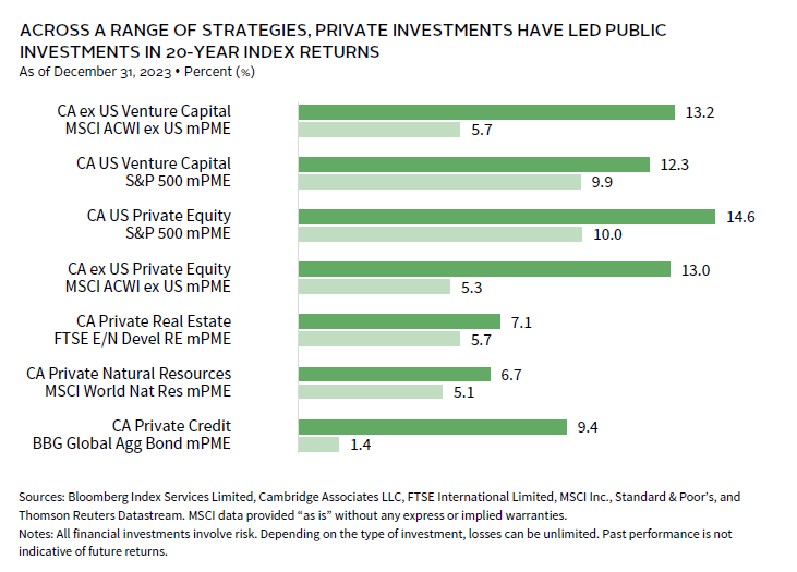 Although CA uses proprietary asset class benchmarks for private investments, standardized public benchmarks for direct investments do not exist. The bespoke nature and complexity of directs often requires investors and their investment managers to instead rely more heavily on their own qualitative assessments and judgments related to the intrinsic value of the asset.