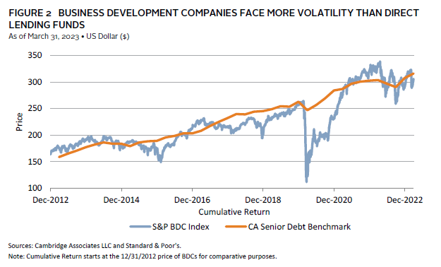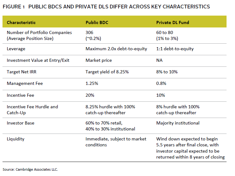 Public BDCs and private DL strategies differ in important ways, including liquidity and leverage, volatility, fees, underlying exposure, and loan origination opportunity. Plan sponsors should consider these differences carefully as they make determinations about their private debt exposure. Figure 1 depicts an example of a public BDC and a private DL fund offered by the same manager and how they differ across key characteristics.