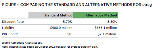 Figure 1 compares the two methods for the 2023 plan year for a plan that is fully funded on an accounting basis. Based on the difference in discount rates produced by these methods, the Alternative Method can result in a more than $7 million premium for a plan that is $500 million in size.
