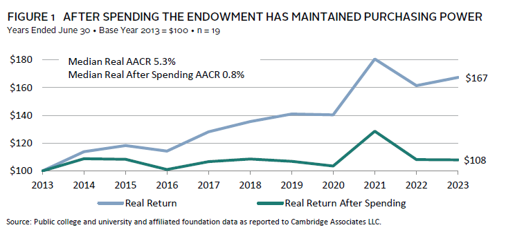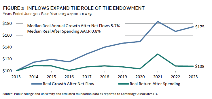 Over the past ten years, the median experience of public university endowments has met that goal (Figure 1). After adjusting for inflation, investment returns, and spending, an endowment starting at $100 in 2013 grew to an adjusted value of $108 in 2023. The median real (adjusted for inflation) average annual compound return (AACR) of 5.3% slightly exceeded spending, and the median growth rate net of spending was 0.8%. This growth indicates that the endowment maintained purchasing power and delivered to donors and stakeholders who have consistently benefited from endowment spending.