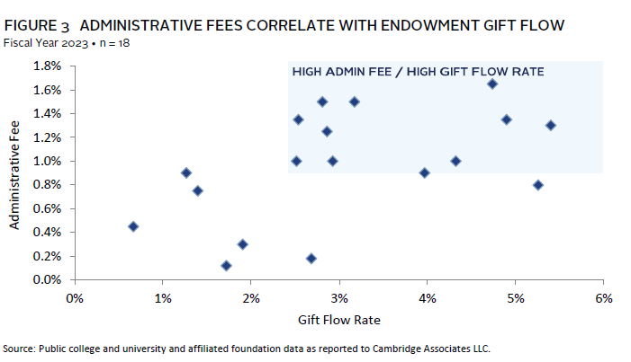 There is a delicate balance between spending, sustainability, and growth, especially when sourcing revenue enhancing funding from an administrative fee assessed on endowment assets. The implementation and disbursement of the administrative fee is a balancing act, with a goal to fund strategic investments and growth without eroding the purchasing power of existing endowment funds. For those that strike the right balance, the admin fee can support sustainability and growth. But if the admin fee is too high, it will erode purchasing power and ultimately divert resources away from the mission. It is the responsibility of the board, with direction from the investment committee and the finance committee, to strike this balance. The calibration of endowment uses and sources will affect investment performance, liquidity, spending, and sustainable growth. When applied strategically, the admin fee can be an investment in endowment growth (Figure 3). In 2023, we saw a correlation between levels of admin fees and endowment fundraising achievement; those with admin fees of 1% or higher experience gift flow rates of 3% and above.