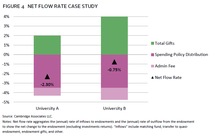 In the following case study, we consider the correlation between net flow and specifically how a higher administrative fee that yields higher gift flow can expand the endowment support delivered to the university. We model two public university endowments over the past ten years that both earn the average investment returns for their peer group (7.9% nominal AACR) and have the same spending policy rate (3.5% effective spending). University A assesses a lower admin fee of 0.8% and has a gift flow of 2.0%, while University B has a higher admin fee of 1.25% and a higher gift flow of 4.0% (Figure 4).