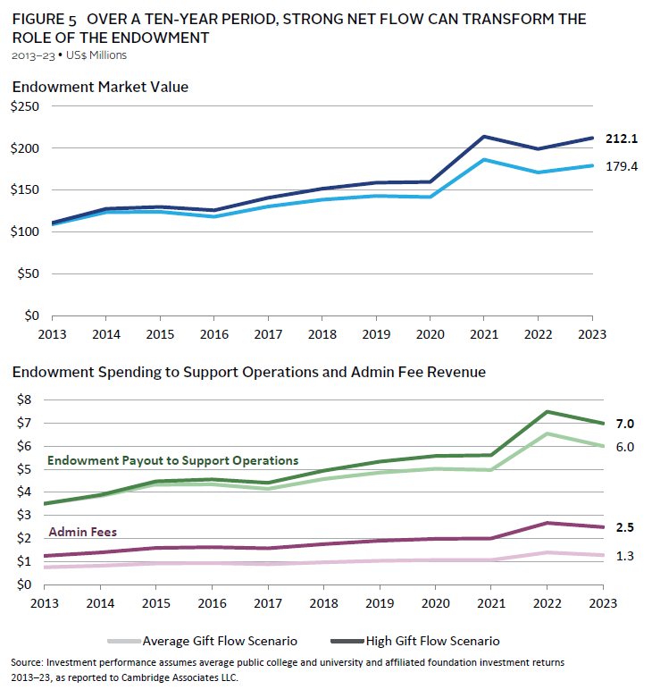 To move beyond maintenance of current spending levels and expand the role of endowment assets, a university needs to raise new endowment funds. New inflows increase the purchasing power of the endowment, and the endowment spending that funds the mission. Inflows represent new commitments to funding more of the mission. A growing endowment relieves reliance on student revenues, state appropriations, and annual fundraising dollars. Inflows also provide an investment advantage, as they replenish endowment liquidity needed to fund spending. They offer more flexibility for the investment strategy to incorporate illiquidity that comes with long-term investment commitments in venture capital and private equity.