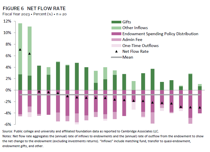 In 2023 we saw a range of net flow results for public colleges, universities, and affiliated foundations (Figure 6). The net flow rate is time-sensitive, and we expect it to fluctuate year to year because the ratio is a function of fiscal year spending and fundraising achievement (dollars in the door) and market values.