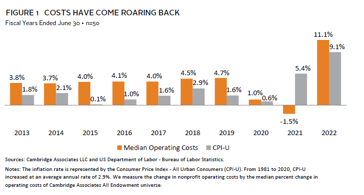 Inflation is having a moment. After laying low and playing a minor role in institutional 1 financial decisions for decades, inflation has soared, dominating headlines and raising expectations for future costs. In addition to its impact on financial markets and investment portfolios, inflation increases the costs of delivering the nonprofit mission and makes it more challenging to maintain the endowment’s purchasing power. This paper discusses the impact high inflation is having on institutional operating budgets and the endowment’s ability to keep pace. We also consider how high inflation can materially inflate the annual endowment spending calculation when an inflation index is a component of the spending policy. After many years of behaving like a gentle nudge, inflation has become a big shove, raising costs and spending calculations.