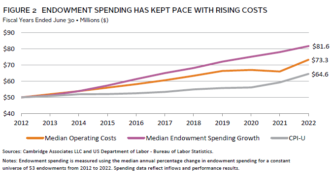 Using a longer-term lens, we see that endowment spending has met this goal, keeping pace with the costs of delivering the mission and inflation over the last decade (Figure 2).