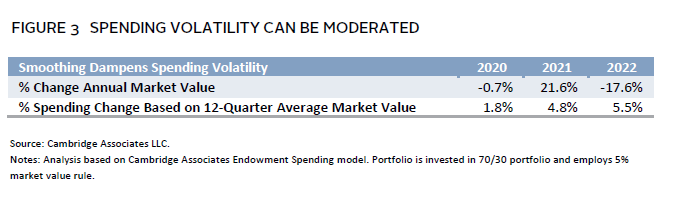 Endowment spending policies are designed to balance the endowment’s near-term funding needs and the long-term purchasing power. The majority (72%) of institutions in the Cambridge Associates 2022 Spending Policies and Practices Study employ a market value–based spending policy to achieve this goal. A market value–based rule calculates annual spending as a percent of a recent market value, or an average of multiple market values, known as a trailing average. Spending generated by a market value rule tends to fluctuate with investment performance. Volatility in spending linked to the market value can be moderated by employing an average of trailing market values. For example, when the market value of a representative portfolio increased 21.6% in 2021, spending based on the same portfolio’s 12-quarter average market value moderately increased 4.8%. The opposite is also true in down markets. In 2022, when endowments weathered negative investment performance, the portfolio market value declined 17.6% after spending, and the spending based on a 12-quarter average value increased 5.5% because the negative return year was moderated by prior years with positive returns (Figure 3).