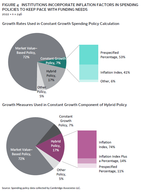 Approximately 25% of endowed institutions rely on a policy that incorporates inflation factors to keep pace with funding needs. A constant growth spending policy calculates a spending amount by increasing the prior year spending amount by a prespecified percentage or an amount linked to inflation. Constant growth rules are employed by 17 institutions (7%) in our annual study. More than half of those institutions rely on a prespecified percentage growth factor for the constant growth component of the calculation, and approximately 40% link growth to CPI. As such, high inflation can supercharge the spending policy calculation for a spending rule linked to an inflation index and erode the purchasing power of the endowment if inflation is not short lived.