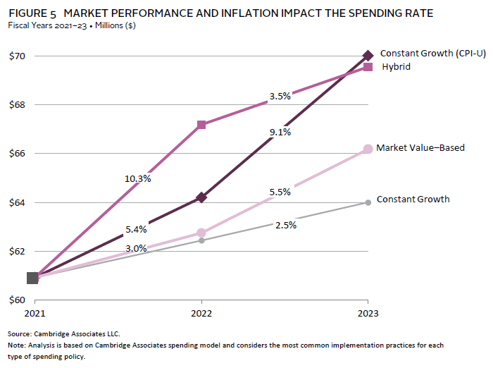 An institution that has had an inflation-linked rule in place will have been spending less in low-inflationary years and will have more purchasing power to work with in a high inflationary period. This is the power of implementing a spending policy over the long term, rather than shifting policy to time a market cycle. The inflation-linked rule will be ready for high inflation if it has been in place during the prior low-inflationary period. The market value rule will deliver more spending in higher performance cycles and less in a low-return period.