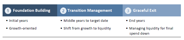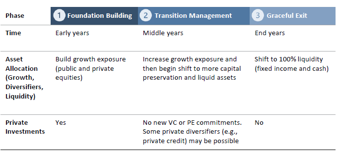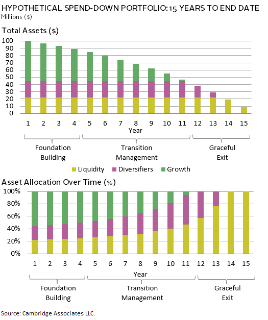Our framework starts with liquidity management, working backward from the target end date. The goal is to ensure sufficient liquid assets to support a pre-determined number of years’ spending (i.e., minimum coverage ratio), and a buffer for additional years through lower-risk diversifying assets. Taking this approach also helps determine how much the portfolio can afford to invest in growth assets: in the early years, when spending needs are relatively low, more growth-seeking investments can be appropriate—including private equity and venture capital. Over the middle years, a keen eye on liquidity and spending coverage helps develop a transition plan to a more defensive portfolio, especially as the end years approach.
