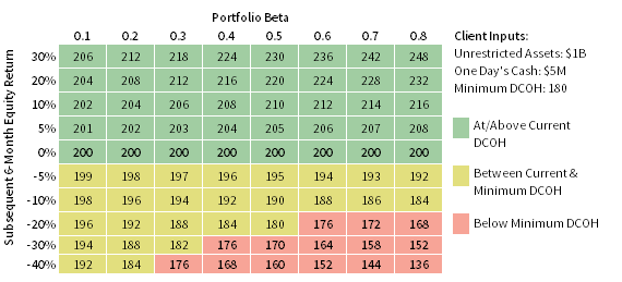 Compare needs and sources, and develop a plan to raise liquidity for the near term. Healthcare systems should determine the order by which cash will be raised, and understand what impact, if any, net cash needs will have on longer term pools. A sensitivity analysis using a model as shown below can inform the enterprise’s ability to withstand further market drawdowns. By entering three inputs (unrestricted assets, one day’s cash needs, and minimum days cash on hand), the model suggests return scenarios in which the healthcare system violates days cash—a proxy we use to understand how much more risk a system can take, or if there is a need to de-risk. With the sensitivity analysis done, using conservative assumptions, institutions should work to determine how much liquidity may be required to carve out of the LTIP.