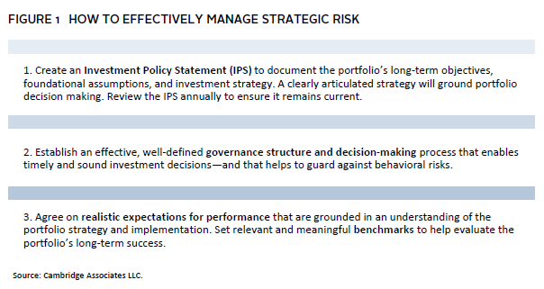 Taking action to avoid these missteps and to establish clear expectations for the portfolio is fundamental to managing strategic risk. Clarity here will help ensure the portfolio remains aligned with the amount of risk a family is willing to take to meet their goals and will increase the chances that the portfolio can be successfully managed through inevitable periods of market volatility. Establishing distinct objectives will also help investors avoid decisions born out of fear and uncertainty that can permanently destroy value.
